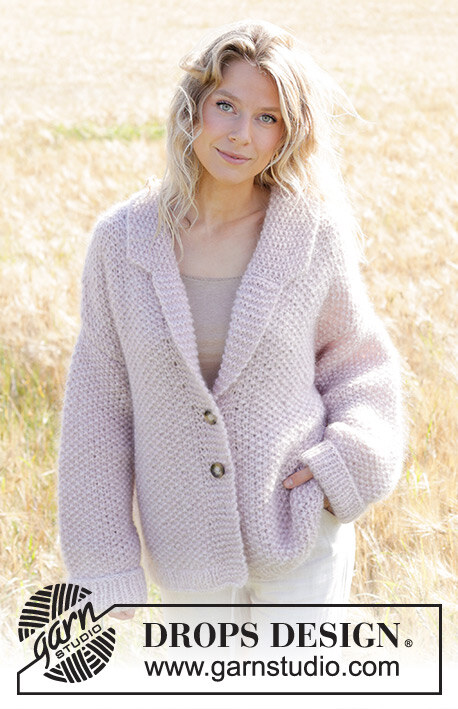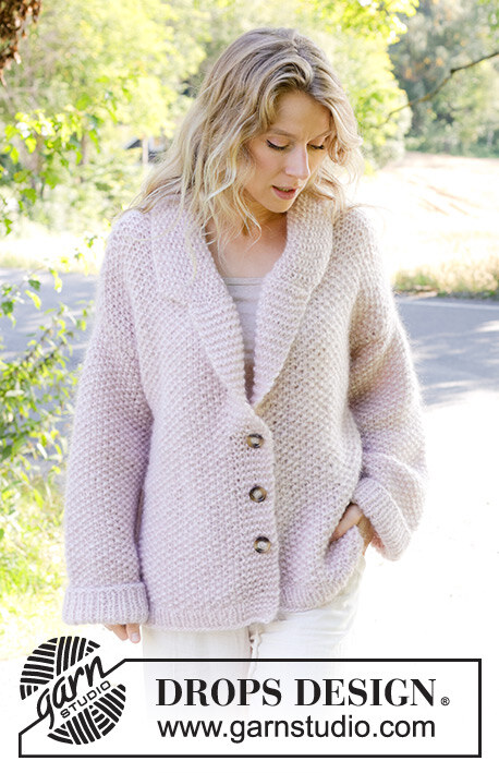 Alhaalta ylös neulottu oversize-jakku 1-kertaisesta DROPS Air-langasta + 2-kertaisesta DROPS Kid-Silk -langasta. Työssä on helmineuletta, kaulus ja kiinniommellut hihat. Koot XS - XXL.