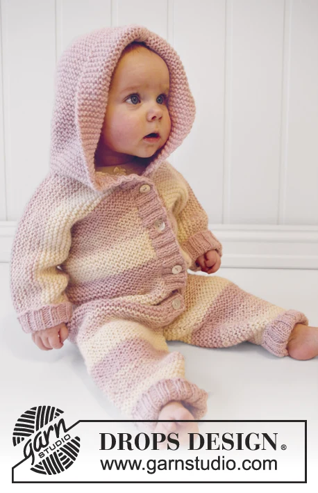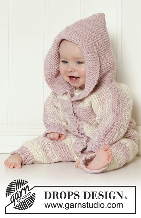 Neulottu haalari raidoilla ja hupulla vauvalle 2-langasta DROPS Alpaca . Koko 0-4 vuotta