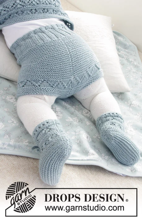 Setti sisältää: Neulotut shortsit ja tossut reikäkuviolla ja ainaoikeinneuleella vauvalle. Koko <0 (= ennenaikainen) - 4 vuotta. Setti on neulottu DROPS Baby Merino -langasta
