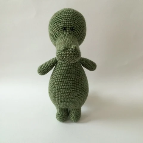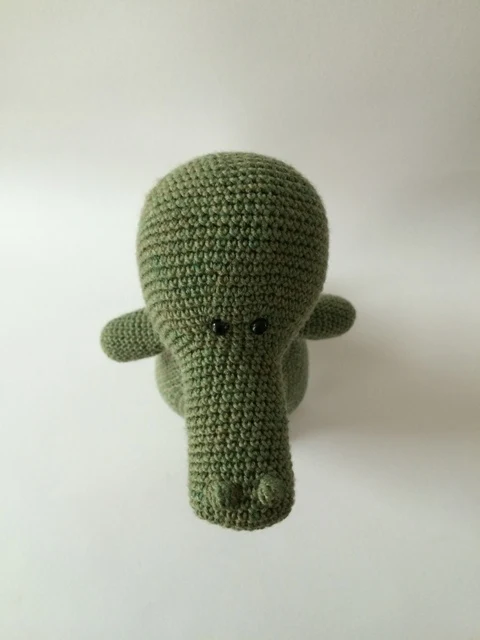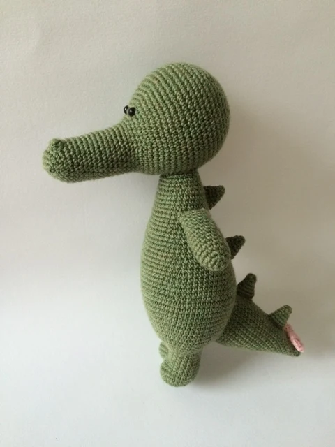 Tuote: Yksityiskohtainen virkkauskuvio krokotiili Wilmalle, jossa pieni virkattu rusetti pyrstössä.