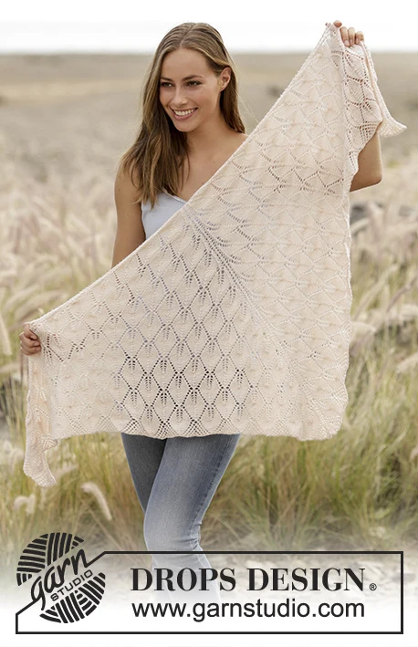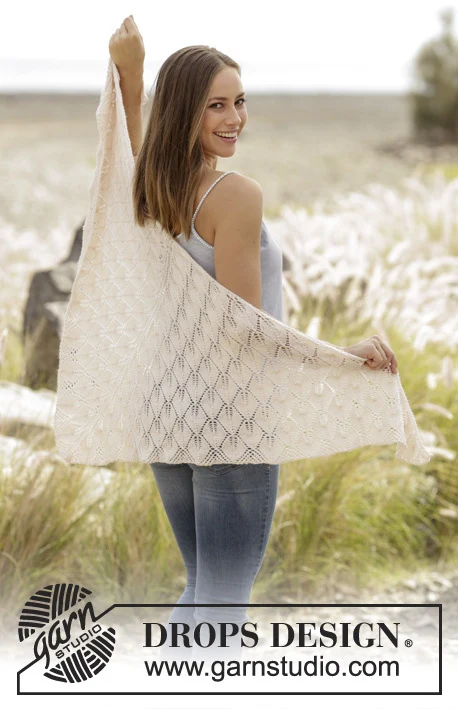 Neulottu lehtikuvioinen huivi DROPS BabyAlpaca Silk -langasta , neulottu ylhäältä alas.