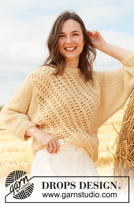 Neulottu pusero DROPS Baby Alpaca Silk- ja DROPS Kid-Silk -langoista . Työ on neulottu onttokuviolla ¾ pitkät hihat sileää neuletta ja reunat ainaoikeaa. Koko S-XXXL.