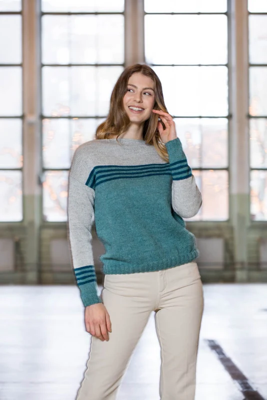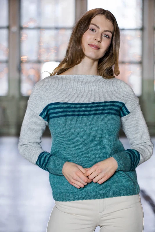 Naisten pusero, jossa värinvaihto ja raidat, neulottu Du Store Alpaca Strong -langasta . Str. XXS-XXXL.