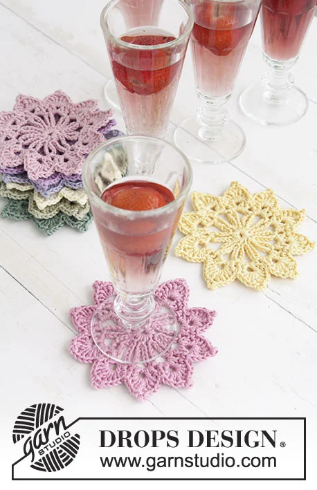 Virkatut DROPS pöytäsuojat DROPS Nutmeg-langasta.