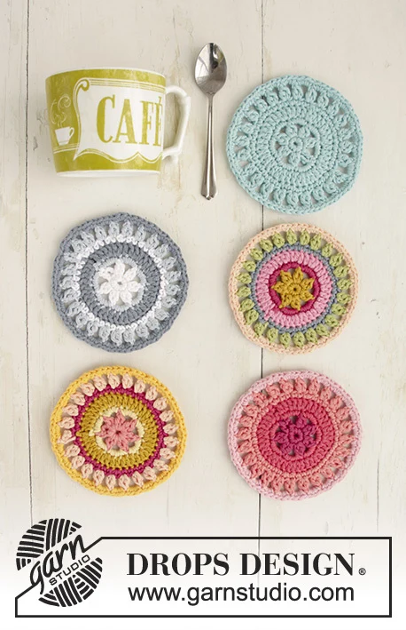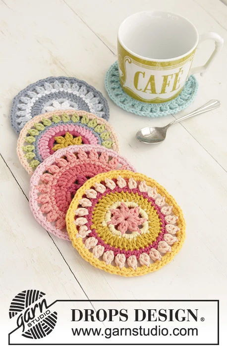 Virkatut pöytäsuojat. Työ on virkattu DROPS Paris -langasta