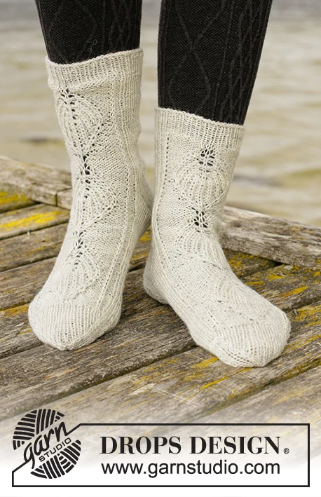 Neulotut sukat DROPS Fable -langasta. Työ on neulottu ylhäältä alas lehtikuviolla puolipatentissa. Koot 35-43.