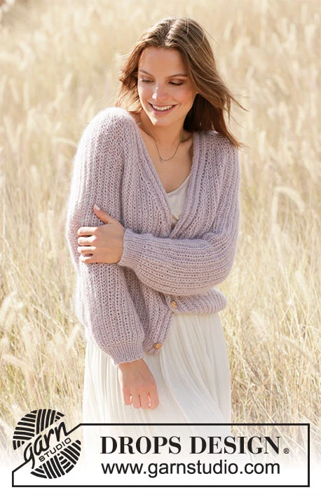 Neulottu takki DROPS Alpaca- ja DROPS Kid-Silk -langoista . Työ on neulottu ylhäältä alas täyspatentilla raglanilla ja v-pääntiellä. Koot XS-XXL.