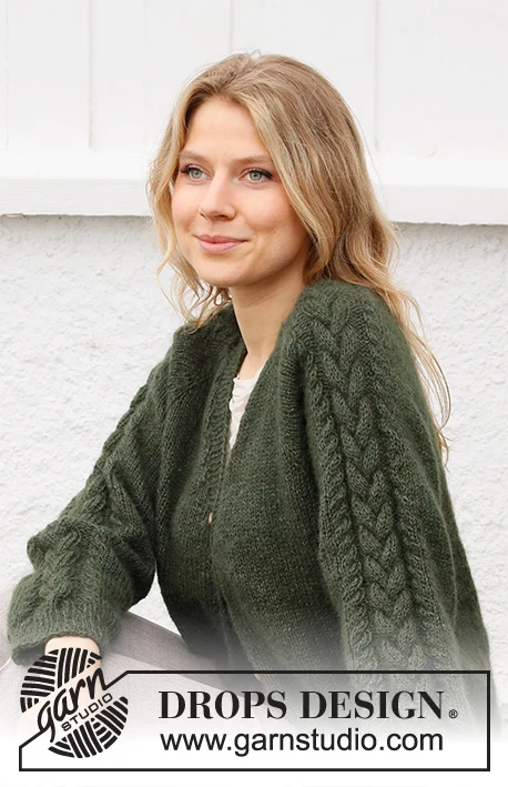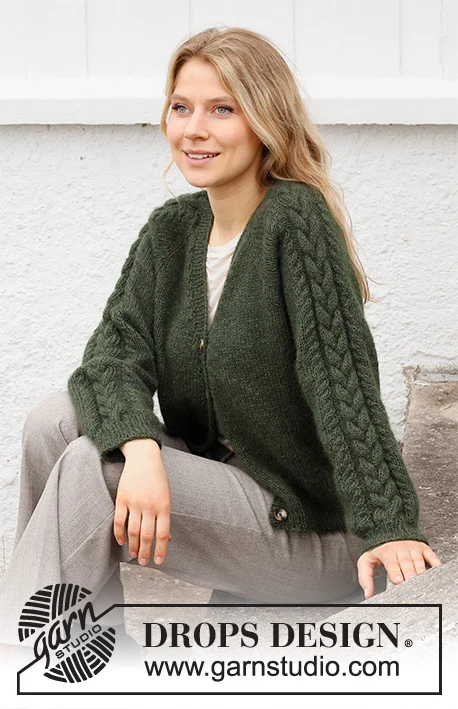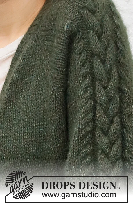 Neulottu takki DROPS Alpaca- ja DROPS Kid-Silk -langoista . Työ on neulottu ylhäältä alas raglanilla, kierteillä ja v-pääntiellä. Koko S-XXXL.