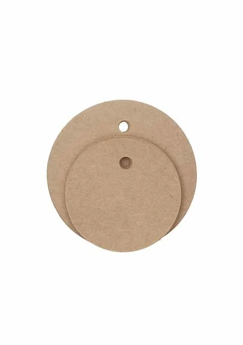 Valkoiset, pyöreät luonnonväriset lahjalaput.