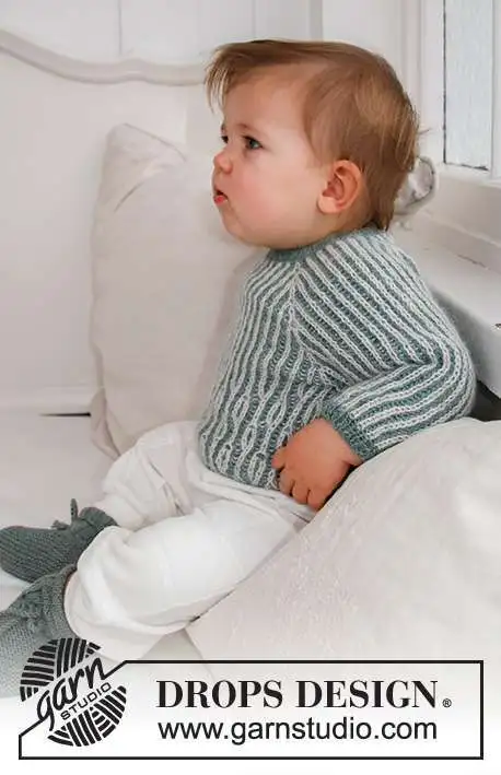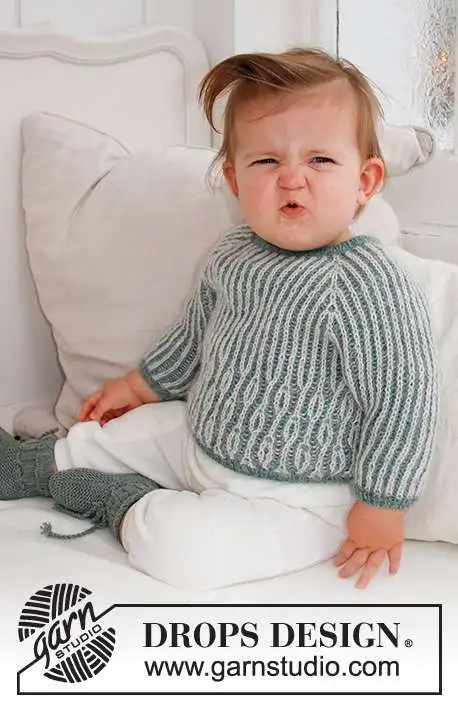 Neulottu pusero vauvalle ja lapsille DROPS Alpaca -langasta . Työ on neulottu ylhäältä alas raglanilla ja 2-värisellä täyspatentilla. Koko 0-4 vuotta.