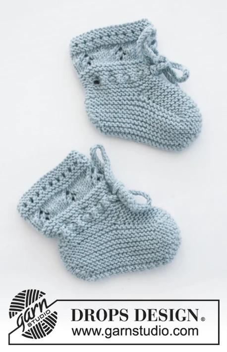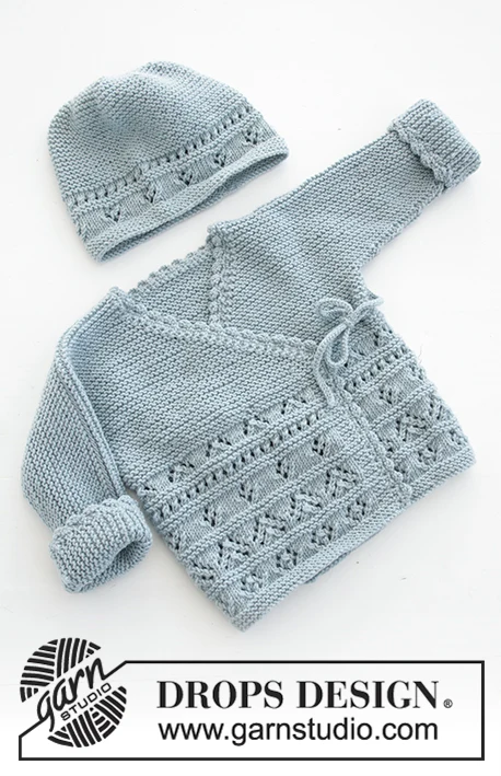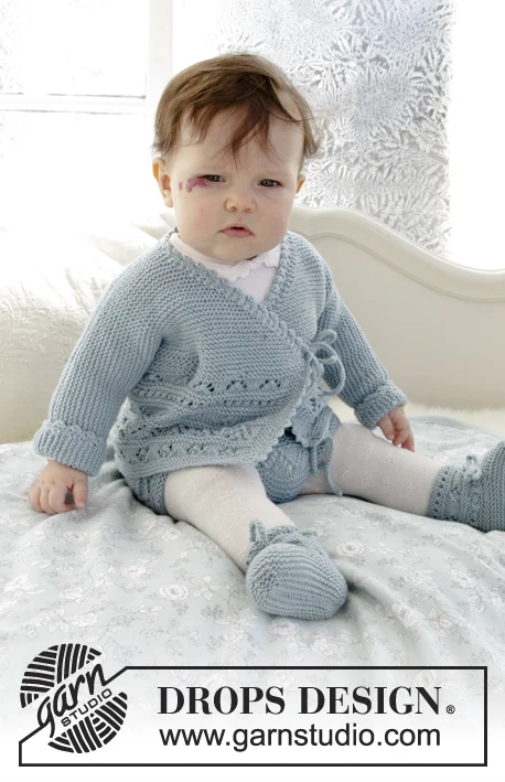 Setti sisältää: Neulottu takki ilman hihansaumoja ja tossut reikäkuviolla ja ainaoikeaneulella vauvalle. Koko ennenaikainen - 4 vuotta. Setti on neulottu DROPS Baby Merino -langasta.