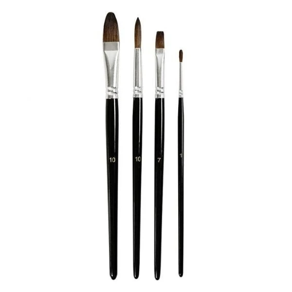 Sisältö: 2 pyöreää harjaa (koko 1 + 10), 1 litteä harja (koko 7) ja 1 kielekkeen muotoinen harja (koko 10)