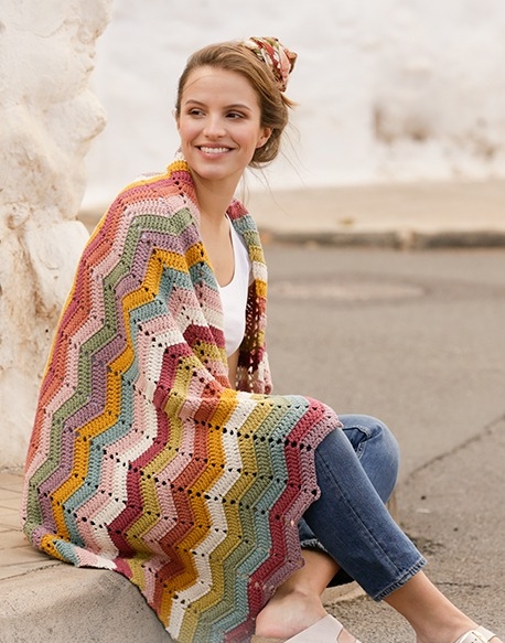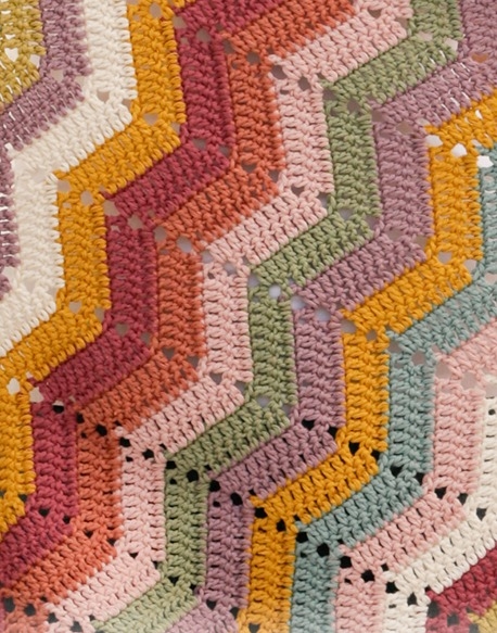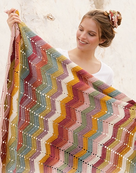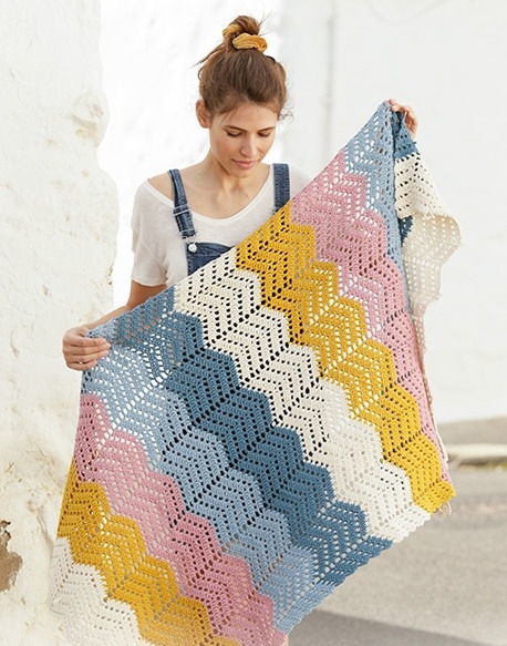 Jos toisaalta pidät enemmän hienosta siksak-kuviosta, niin meillä on myös siihen resepti. Siksak-kuvio on tehty sekoituksella virkattuja ompeleita ja syvennyksiä. Kun tekniikka on vangittu, se on muuten vain siellä. Kuvion voi tehdä useissa väreissä kuten tässä tai säilyttää yhdessä tai muutamassa värissä yhtenäisemmän tuloksen saavuttamiseksi. Päätös on sinun. Myös täällä oleva matto on virkattu Drops Parisista, joka on herkullista puuvillalankaa. Puuvilla on erittäin kestävää, ja se voidaan pestä myös koneessa, joten matto voidaan tuoda rannalle tai metsään.